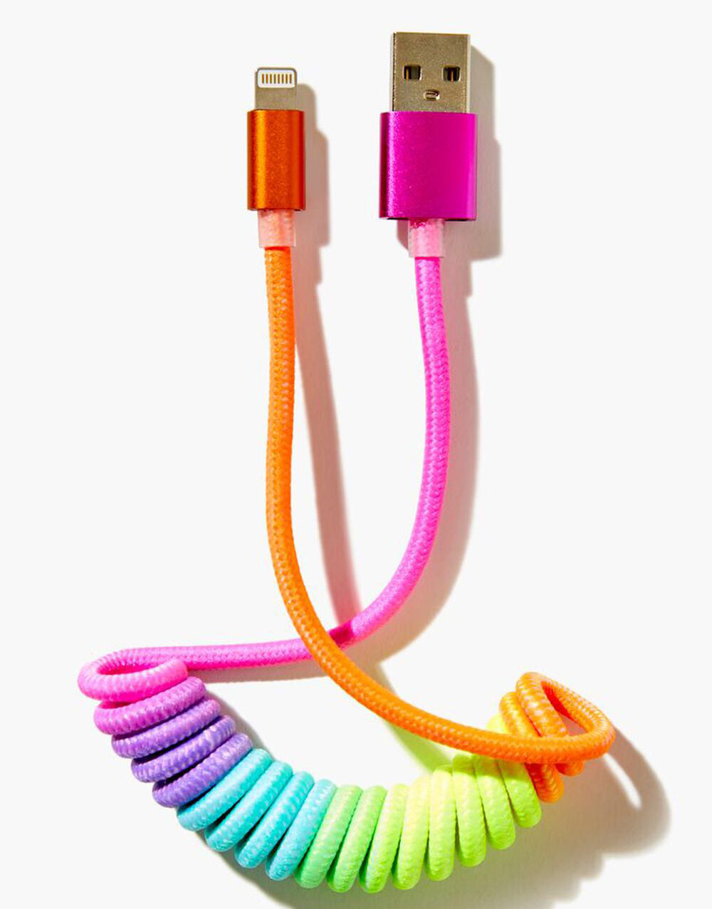 A rainbow charging cable featuring a spiral construction and USB and iPhone connectors.